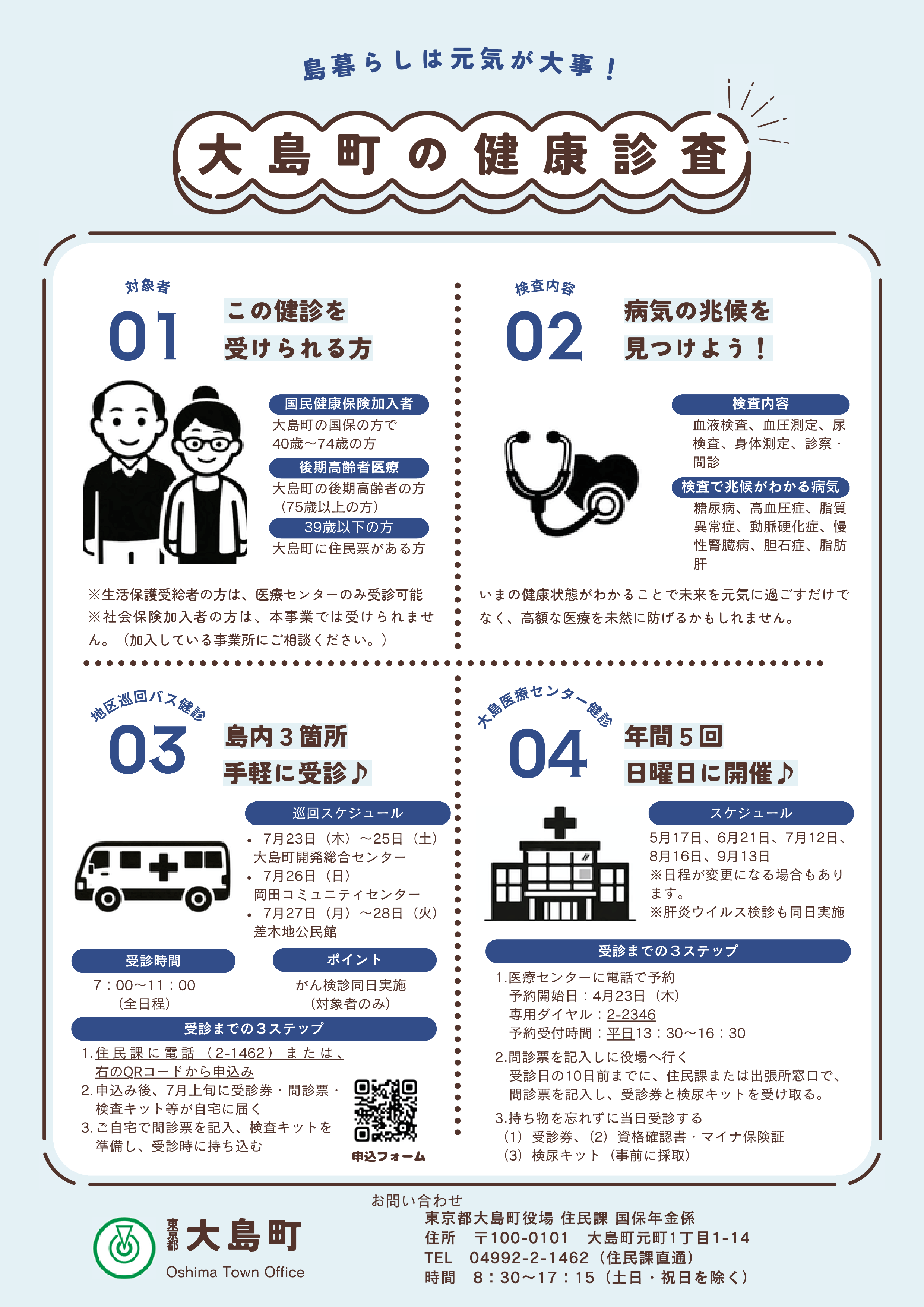 大島医療センターで実施する集団健診と、岡田・差木地・大島町役場の3箇所を巡回する巡回健診を実施いたしますので、この機会に必ず受診してください。