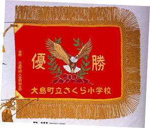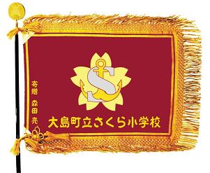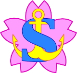 背景は、さくら小学校のシンボルである桜の花びらをモチーフに。Sはさくら小学校の頭文字のS。そしていかりのマークは、学区域である三つの地域のうち、北の山は空の港、空港を持ち、岡田、泉津は港を持つことから。常に外に開かれ、輝かしい未来を願って。